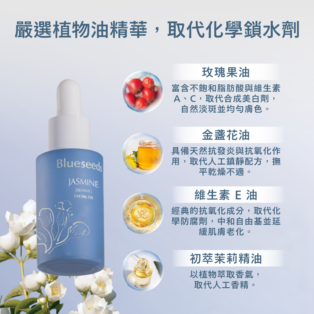 Blueseeds 只用自然農法種出的珍稀小花茉莉,豐富生態孕育出更高的修復能量,堅持清晨採收、新鮮萃取,完整保留茉莉的天然緊緻因子,讓肌膚緊緻、撫平細紋,重新年輕!
