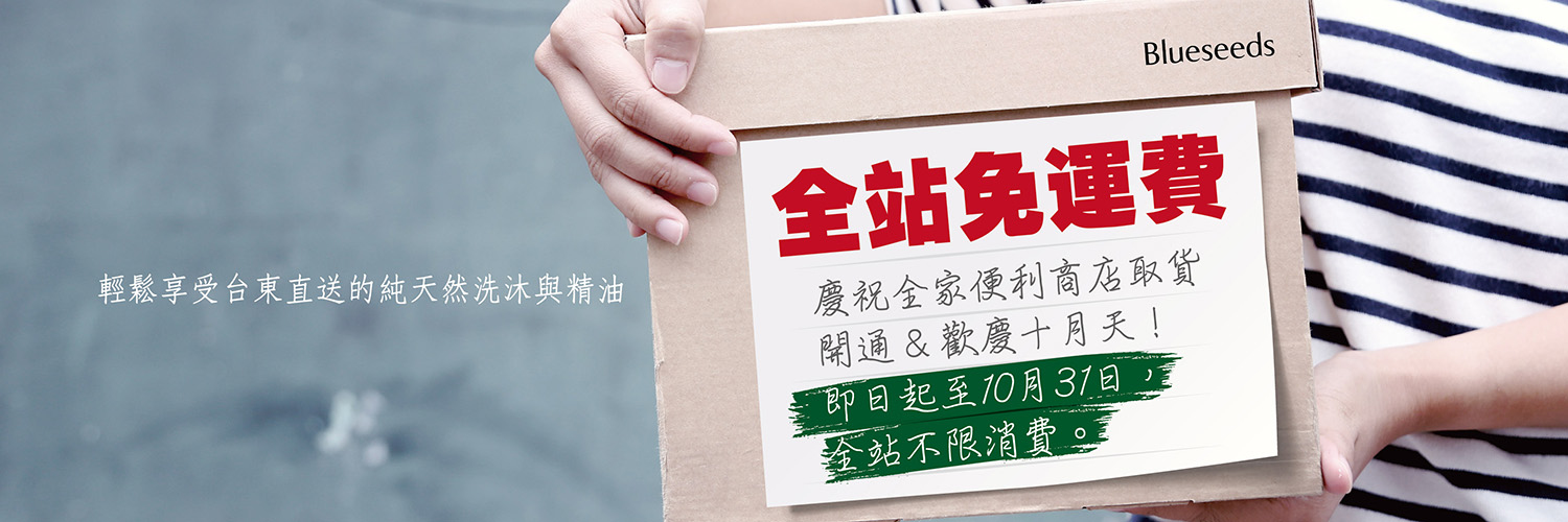 歡慶光輝十月,並慶祝全家便利商店取貨開通,Blueseeds芙彤園官網即日起至10/31(三),全站不限金額消費,皆可享受免運費的服務。季節轉換之際,Blueseeds芙彤園官網也換上新衣,以乾淨、簡單的設計,不添加多餘的元素,就像是我們提供給您最純粹、最天然的堅持,現在您在家不用出門,也可以輕鬆擁有台東農場直送的純天然洗沐用品與精油產品。