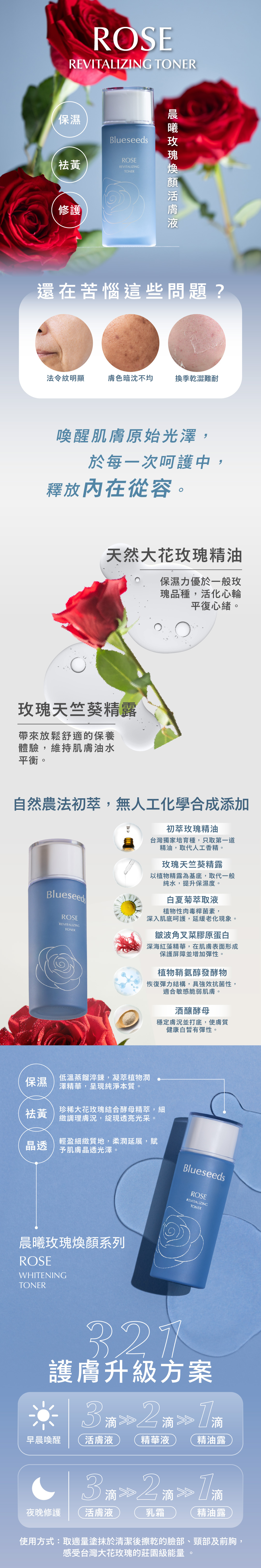Blueseeds 的晨曦玫瑰煥顏保養系列蘊藏數千朵台灣特有大花玫瑰,經茶樹精露灌溉,保濕力卓越,每一滴都充滿大自然的珍貴能量。透過高效活性成分護理肌膚,全系列採用了玫瑰果油、金盞花油、維生素E、乳木果油等多重天然成分,肌膚更穩定、彈潤,成分更天然、有效,膚況更亮更年輕。專門為想要自然抗老的消費者設計,讓肌膚保持年輕光采。