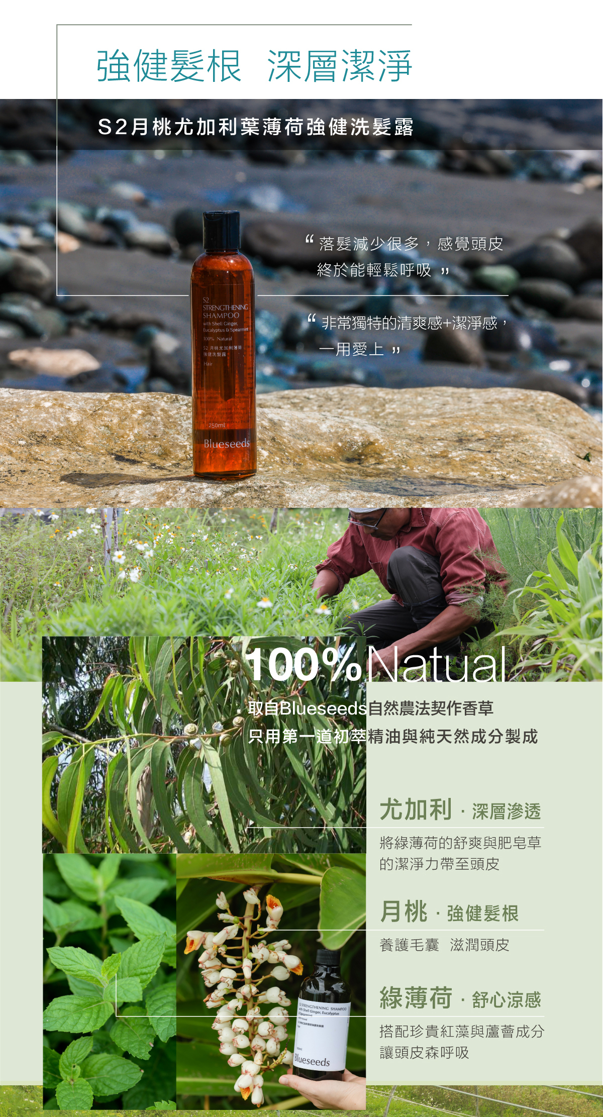 Blueseeds S2月桃尤加利葉薄荷強健洗髮露 在台東以自然農法蘊育出養分較高的月桃、尤加利與綠薄荷,並天然初萃六個月以上熟成的植物精華保留至洗髮露內,內含高濃度精油,清新植物香氣加上珍貴蘆薈與紅藻,讓滋養深入髮根與頭皮。配方中的月桃純露具有保濕、滋潤頭皮、強健髮根的功效。綠薄荷與尤加利葉精油帶來清新氣味與暢快輕盈感,尤加利葉精油的滲透力也能將綠薄荷的舒爽及肥皂草的清潔力帶到深層頭皮,讓洗頭成為解放毛孔、舒緩身心的全新體驗。洗後散發出自然的芳香,清爽且不乾澀。整瓶洗髮露0人工化學合成添加,讓你潔淨秀髮的同時,也對土地友善,不對環境造成污染。