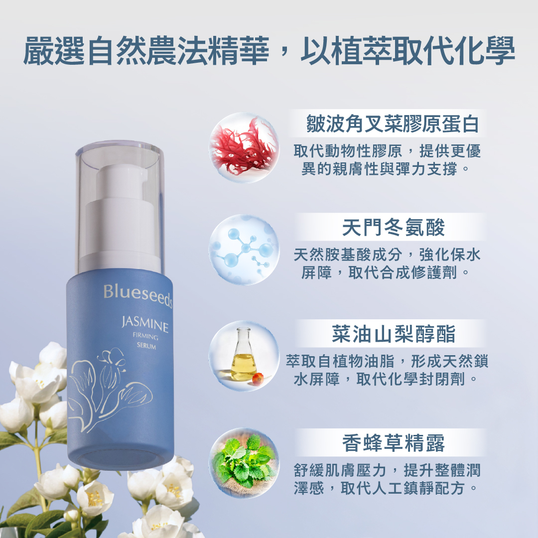花中之王 — 天然茉莉的珍稀,展現出典雅清透的宜人氣息。晨間手工採收初綻茉莉,低溫萃取第一道精露,蘊含豐富活性成分,注入清透質地,深層保濕、舒緩肌膚。添加香蜂草精露提升潤澤與光澤,打造柔嫩明亮的自然膚況,日常使用感受細緻呵護。