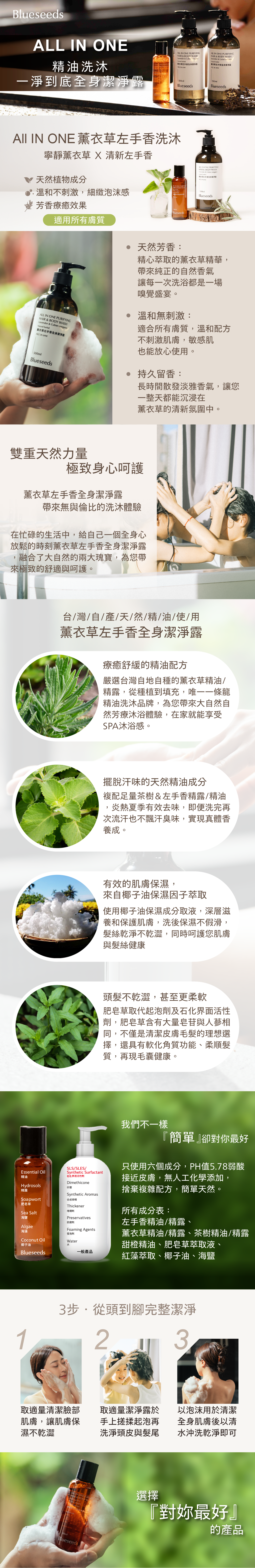 成分精選自放鬆舒緩的薰衣草精油、愉悅心情的甜橙精油,搭配安撫還能順膚的左手香精露為基底,添加珍貴乳酸和茶樹精露,為您帶來從內到外的天然芬芳.零人工化學合成添加,使用自然農法栽種初萃精油精露精心慢製,洗完為您帶放鬆舒適的愜意感。