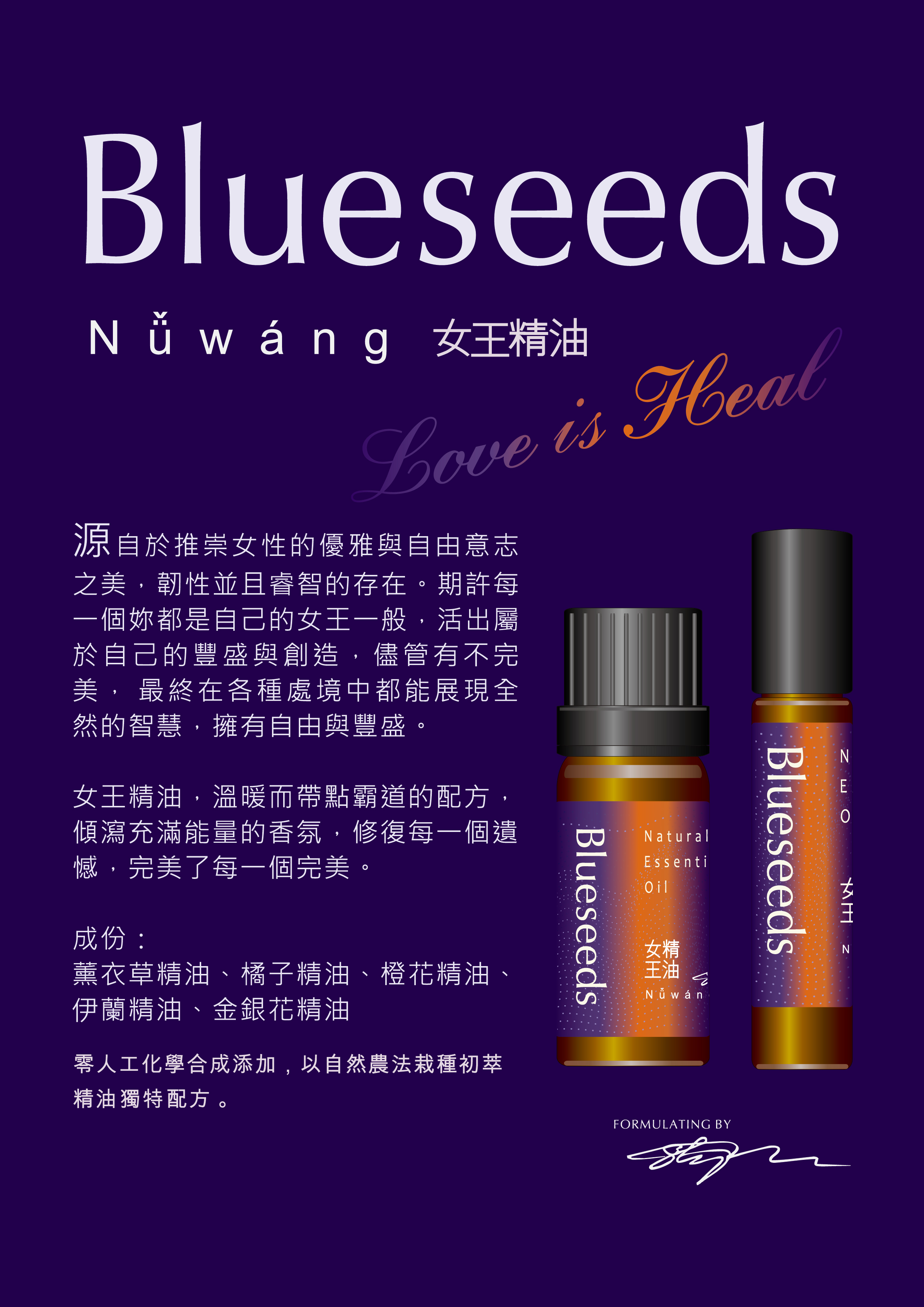 女王精油,溫暖而帶點霸道的配方,傾瀉充滿能量的香氛,修復每一個遺憾,完美了每一個完美。女王精油系列,融合了薰衣草、橙花、伊蘭等天然精油,幫助滋養、平衡、自信。