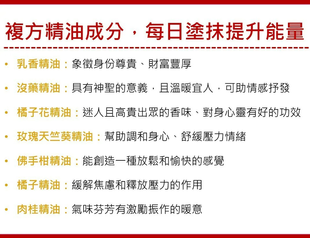 成分:乳香精油、沒藥精油、橘子花精油、玫瑰天竺葵精油、佛手柑精油、橘子精油、肉桂精油、甜杏仁油、小麥胚芽油