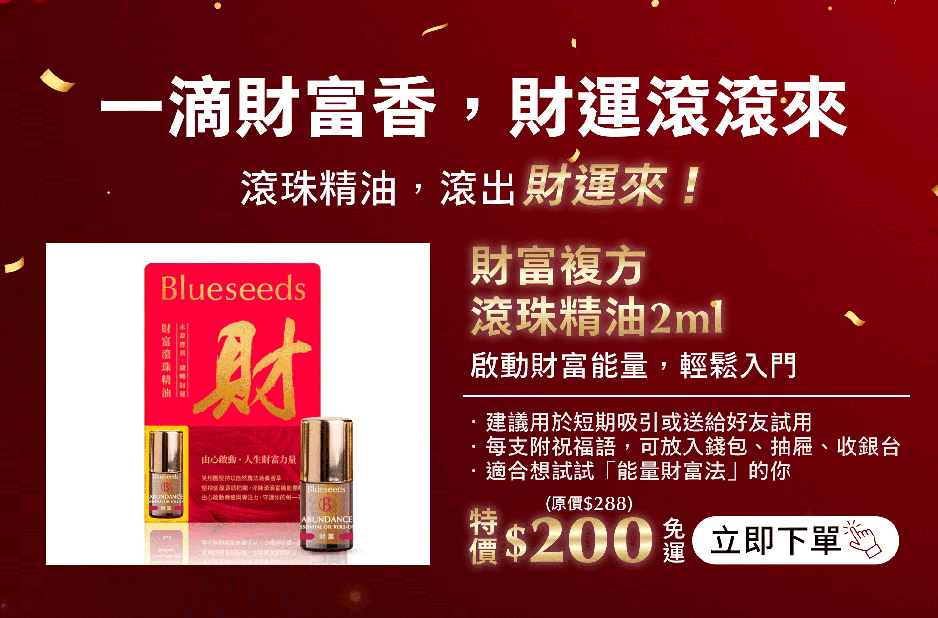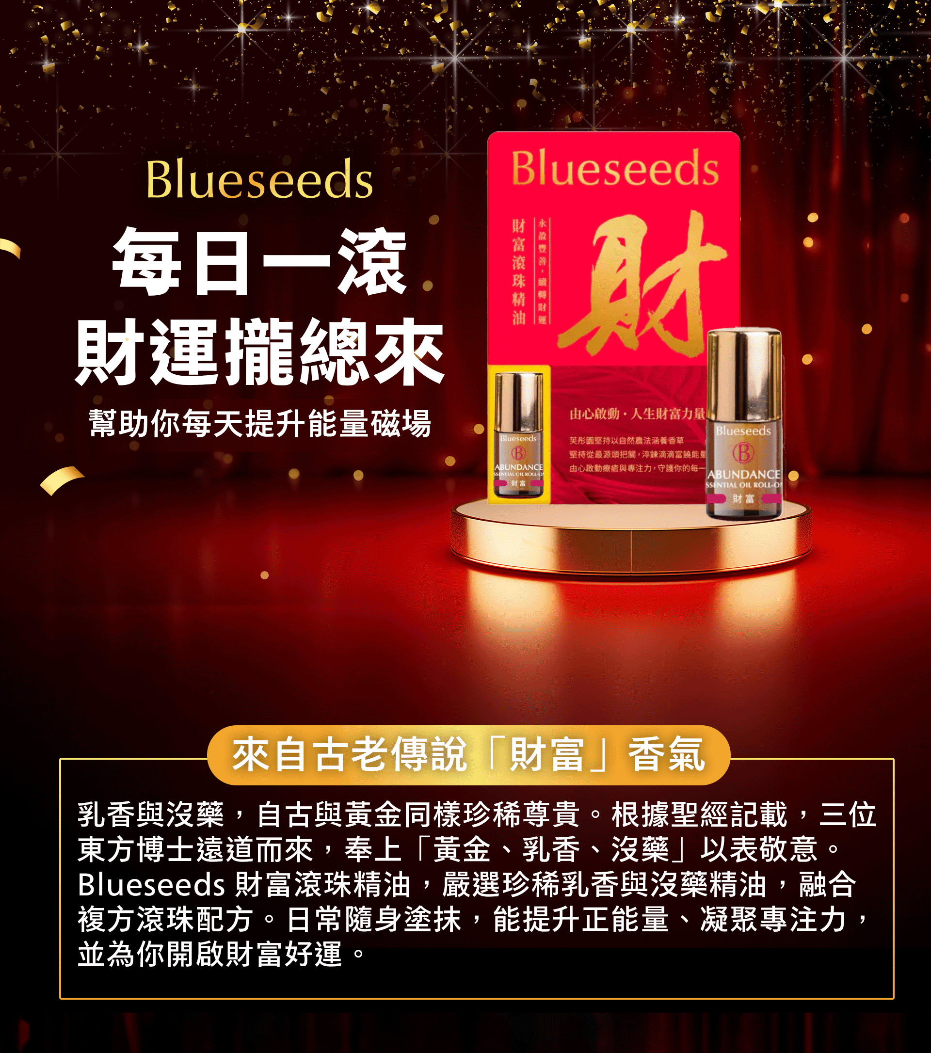 Blueseeds 財富精油正是您在追求成功與財富中的秘密武器,為您的每一次重要會議、商談、合作注入積極能量。這款精油的每一次使用,都是您自信的展現,為您創造更多的財富與機會。