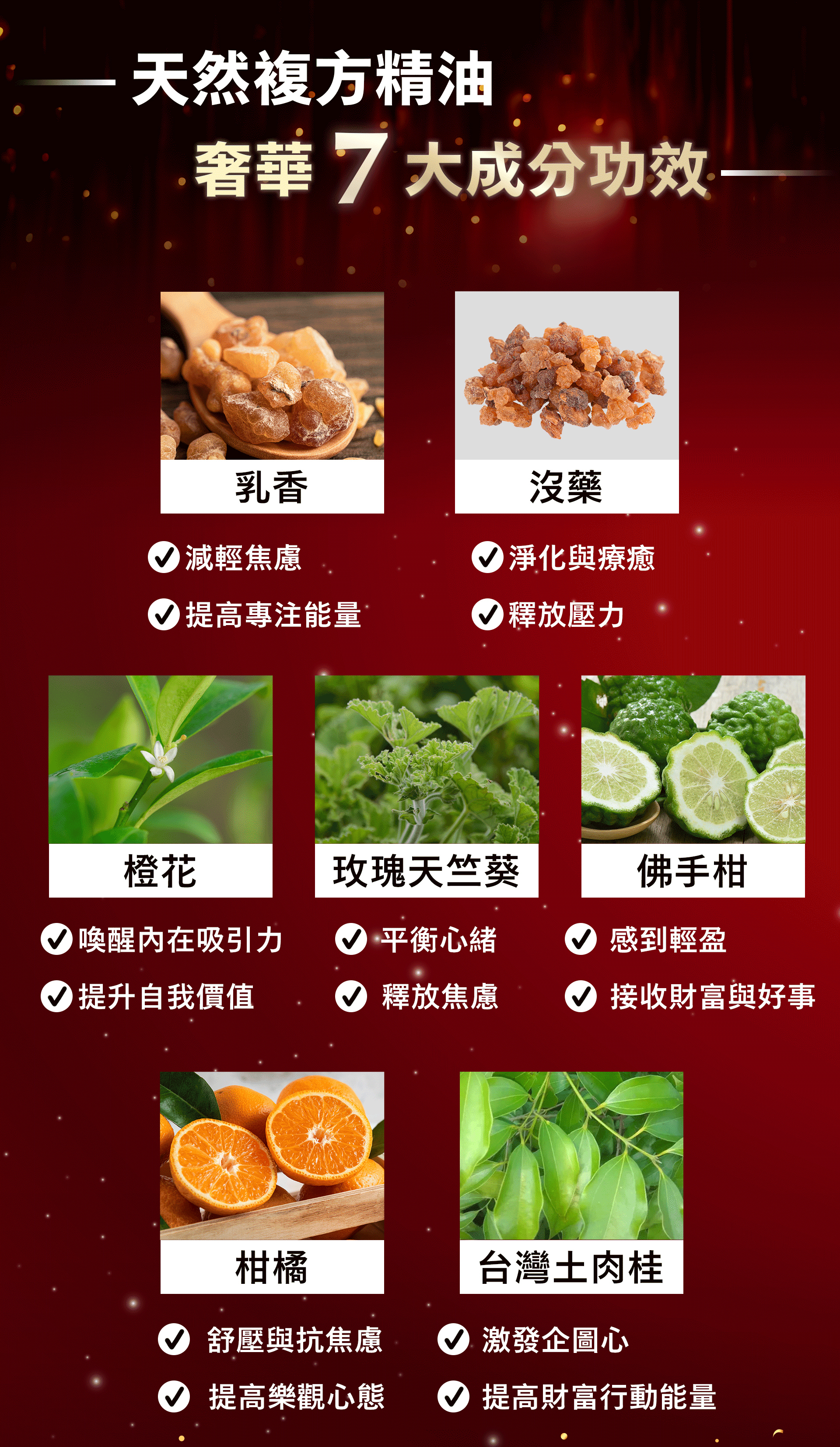 成分:乳香精油、沒藥精油、橘子花精油、玫瑰天竺葵精油、佛手柑精油、橘子精油、肉桂精油、甜杏仁油、小麥胚芽油