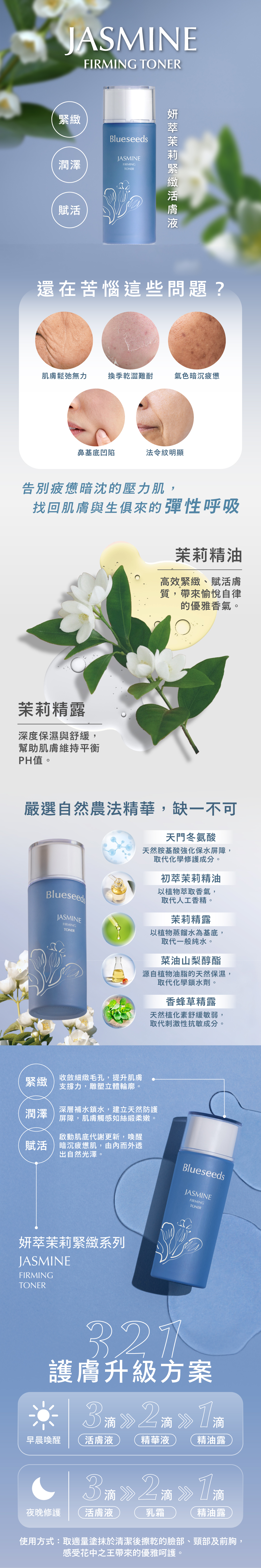 成分:茉莉純露、香蜂草精露、菜油山梨醇酯、天門冬氨酸、茉莉精油、苯乙醇