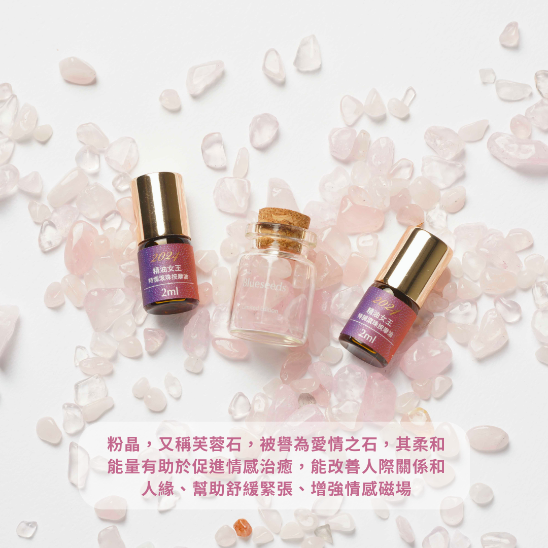 Blueseeds 精選粉晶這顆愛情之石,結合多重珍貴精油,打造專屬於你的能量滾珠精油。揉合珍稀的橙花精油、伊蘭精油、金銀花精油等精華,幫助舒緩心靈、釋放壓力、增進情感磁場。粉晶的柔和能量打開心輪,促進愛與人緣的流動,滾珠設計便於隨時隨地使用,讓你在愛情、事業、人際關係上皆能感受幸福與平靜的力量。